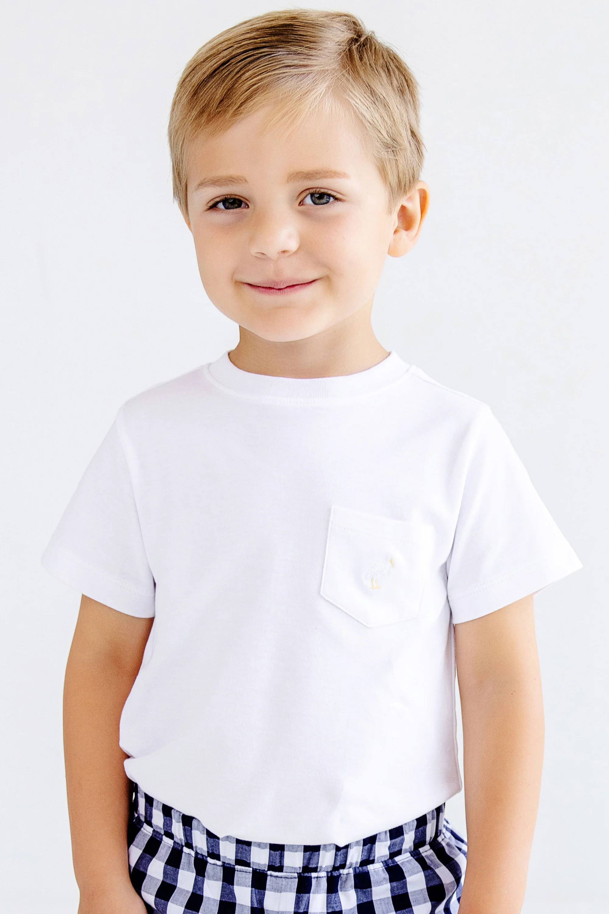 The Carter Crewneck in Worth Avenue White with Multicolor Stork is an everyday essential that brings playful charm to your little gentleman's wardrobe. This versatile short sleeve shirt features our signature multicolor stork embroidery and is ideal for everything from playground adventures to family gatherings. A go-to favorite that pairs with absolutely everything—you'll want to stock up in every size!