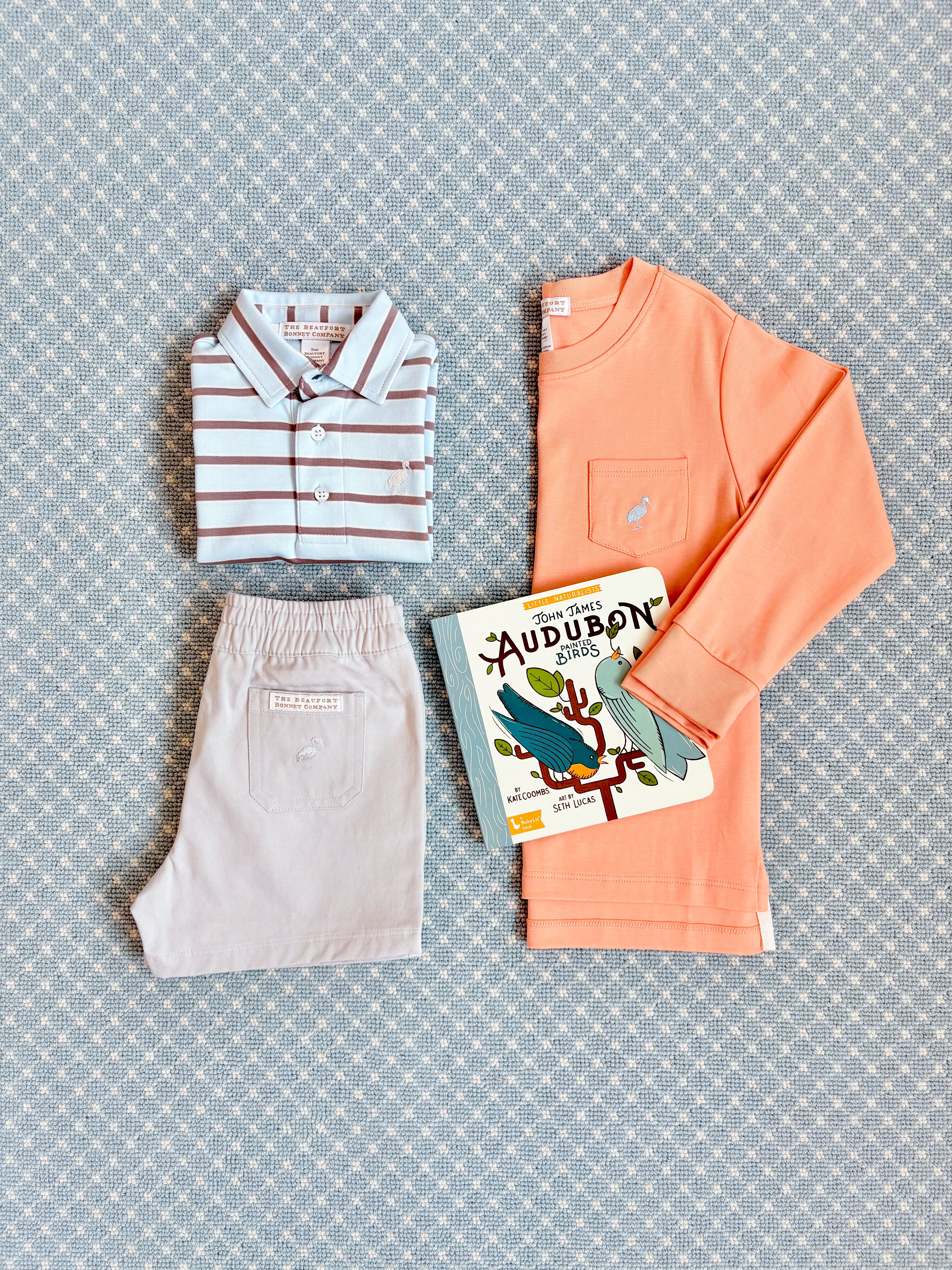 Our Sheffield Shorts in Sandy Springs Stone with Sandy Springs Stone Stork are preppy and practical! The elastic waist makes diaper changes and potty training so much easier, and you'll love how put together he looks. Pair them with any of our Prim & Proper Polos or Carter Crewnecks.