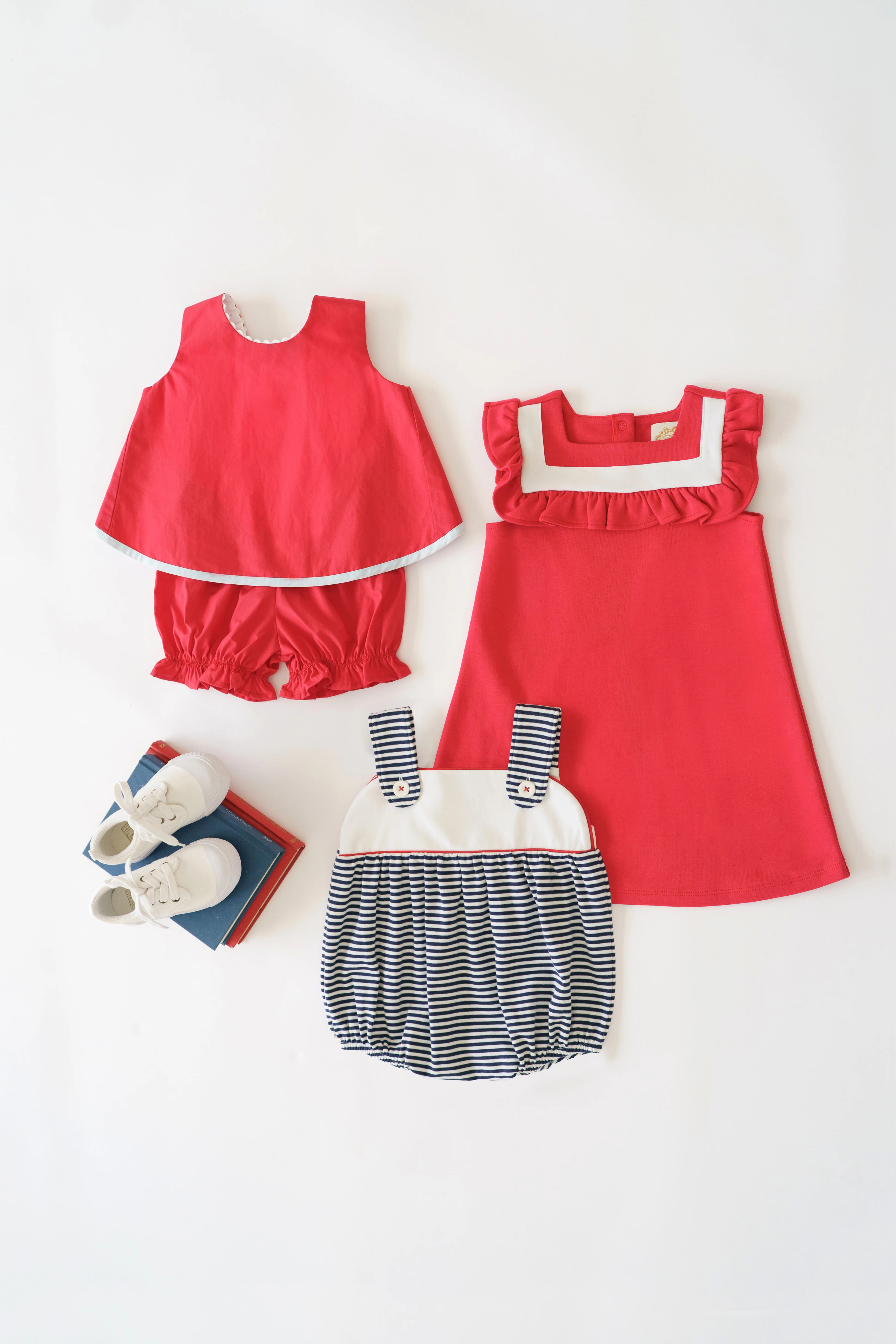 The Susanne Swing Top Set in Richmond Red with Nantucket Navy is the warm-weather outfit that makes getting dressed the easiest part of your day, because when the top and bottom are already perfectly matched, all you have to do is put it on and go! The breezy swing top silhouette is made for sunny days and the bold red top paired with sweet detailing shows that comfort and style can coexist. It's the set that can take her from brunch to a playdate and then to the beach and a backyard barbeque!