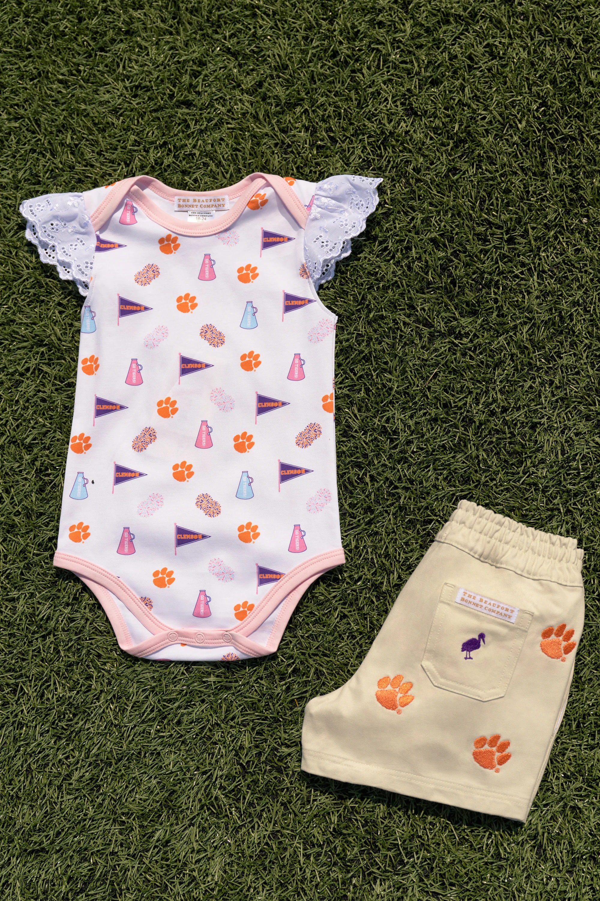 The Clemson Wendy Onesie is as sweet as can! Featuring our exclusive Tiger Triumph print, this onesie is the perfect warm weather game day outfit for the tiniest Clemson fans.